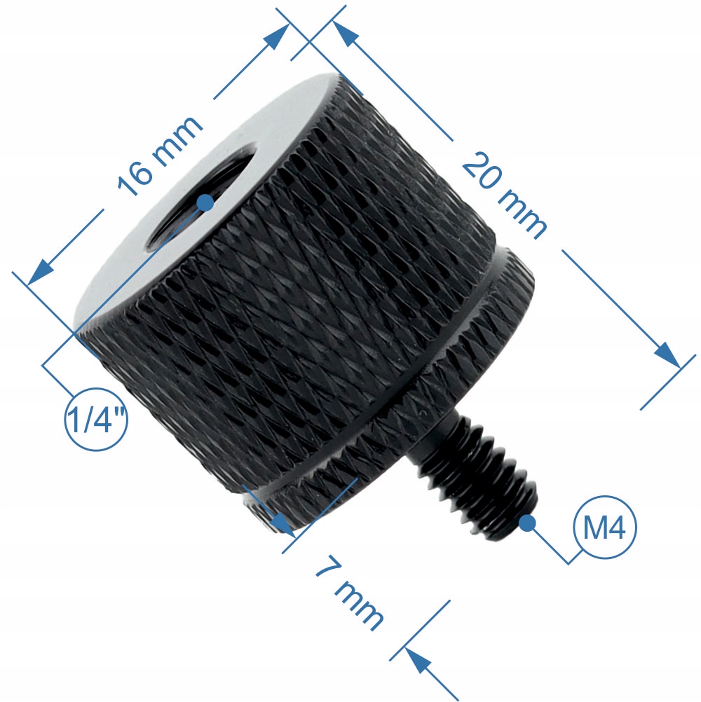 Adapter aluminiowy M4 na 1/4" z radełkowaną powierzchnią. Umożliwia połączenie elementów z gwintem męskim M4 i żeńskim 1/4" w sprzęcie fotograficznym, studyjnym i technicznym.