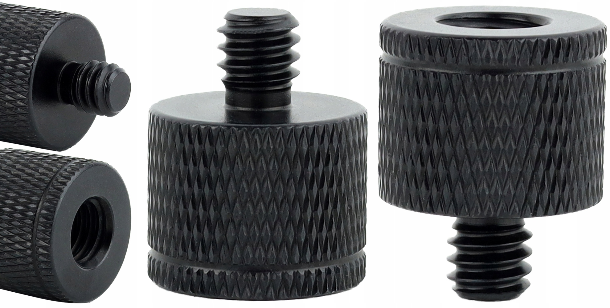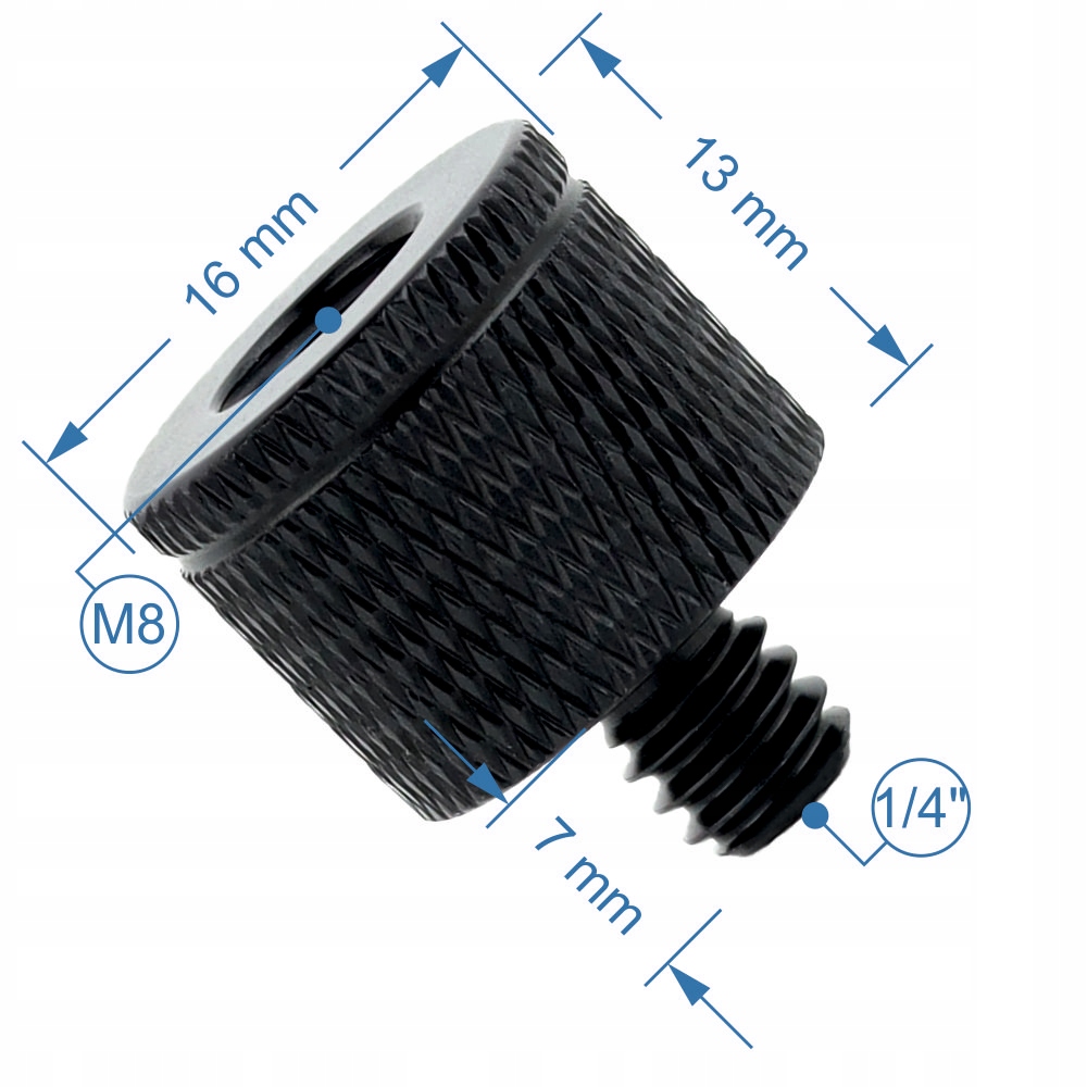 Czarny adapter redukcyjny 1/4" na M8 z radełkowaną powierzchnią. Pozwala połączyć elementy z gwintem męskim 1/4" i żeńskim M8 w sprzęcie foto-video i montażowym.