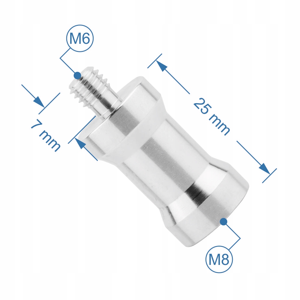Adapter tuleja redukcyjna M6 na M8 wykonana z lekkiego aluminium. Umożliwia połączenie dwóch elementów z gwintem M6 męskim i M8 żeńskim. Pasuje do statywów fotograficznych oraz statywów pod lampy i parasolki studyjne.